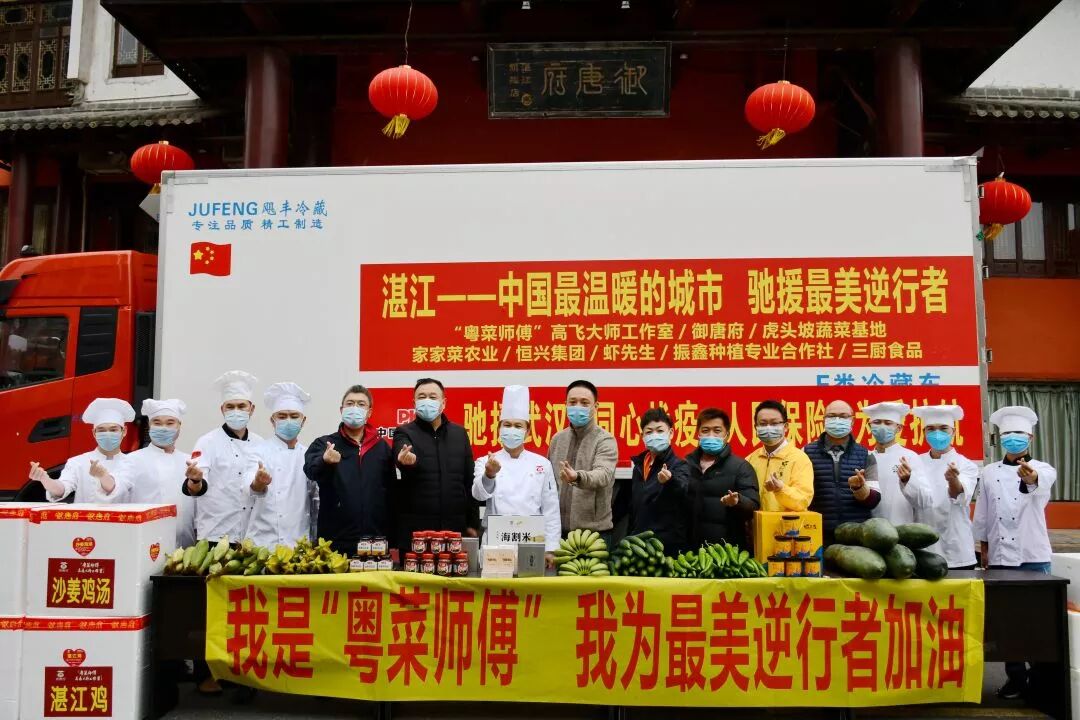 2月16日上午10时,由湛江御唐府企业发展有限公司、“粤菜师傅”高飞大师工作室、遂溪虎头坡粤菜师傅精准扶贫蔬菜基地牵头,湛江市人社局、湛江市农业农村局、共青团湛江市委员会、遂溪县人社局、遂溪县农业农村局及共青团遂溪县委联合发起的一批“湛江味道”物资正式发车前往武汉欧亚会展国际酒店支援湛江首批援鄂医疗队。