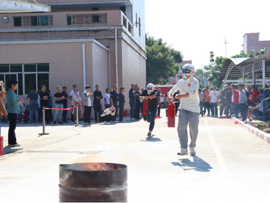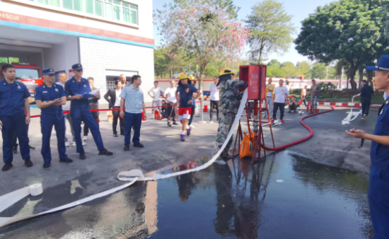 消防安全技能竞赛则通过2人组室内消火栓快速出水操、2人组原地佩戴防毒面具并使用灭火器灭真火等实操项目,考察参赛人员使用消防器材应对火情的熟练程度。