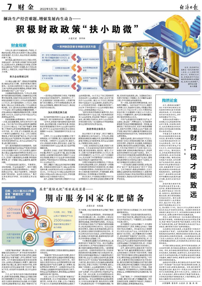 此外,落实好融资奖补政策强扶持。包括指导督促国家融资担保基金严格落实再担保合作业务规模不低于1万亿元的要求;继续实施小微企业融资担保降费奖补政策至2023年;下达小微企业融资担保降费奖补资金30亿元,支持扩大融资担保业务规模、降低担保费率等,进一步缓解小微企业融资难、融资贵问题。