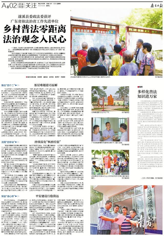 行走在遂溪县城,法治标语和法律故事文化墙随处可见;每到关键节日,主题普法活动从不缺位;借助新媒体平台,普法栏目、节目层出不穷,提供“订单式”普法内容……来自基层一线的探索实践,成为遂溪普法工作的生动缩影。