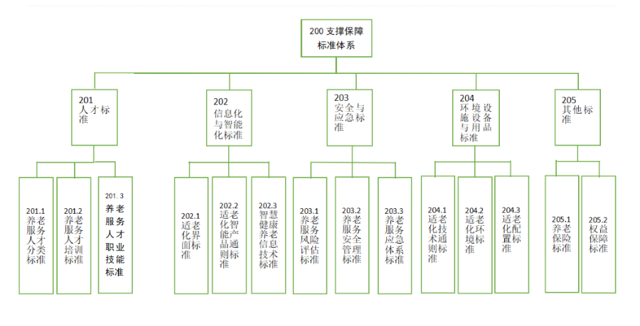 200支撑保障标准是指在养老服务领域内,为支撑养老服务行业中各项工作有效开展而形成的标准,包括人才、设备、环境、信息、安全等标准。本子体系的重点在养老服务人才培养、社区养老服务设施建设标准、智慧养老、老年用品、机构消防安全、安全应急处置等相关领域的标准。