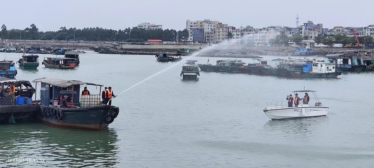 年关将至,渔船失火、商渔船碰撞等影响安全形势稳定的风险增大,各类风险交织叠加。为了做好2023年岁末年初期间渔船安全监管工作,针对渔船有限空间可能会发生的安全隐患,遂溪县海洋综合执法大队联合草潭镇人民政府于2023年1月18日下午15时在草潭渔港开展消防安全演练,现场使用消防船、消防船、消防栓等消防设备模拟渔港内渔船起火后快速到达事故现场组织施救,扑灭大火。随后,遂溪县海洋综合执法大队执法人员在草潭内开展渔船安全生产检查工作,对停泊在港内的大中型渔船的消防设备、船内的电路、船内燃气设备等消防安全隐患开展检查,尚未发现重大的安全隐患。