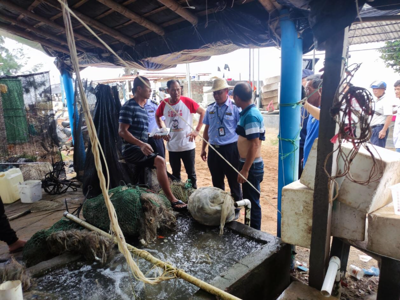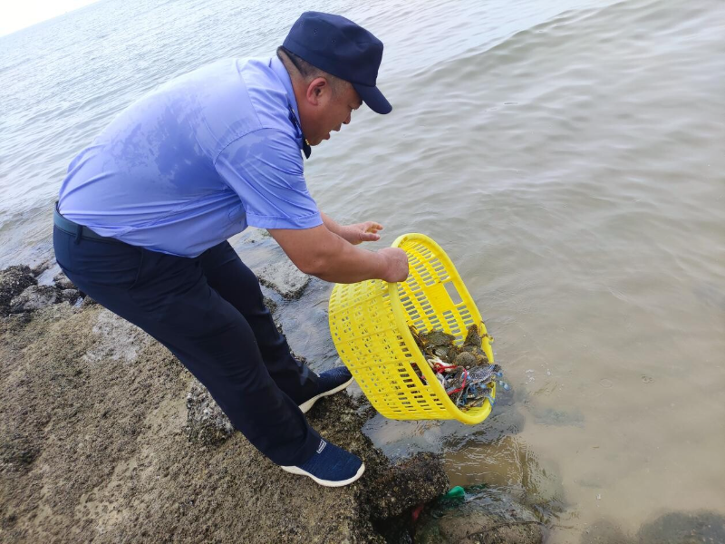 遂溪县海洋综合执法大队不定期对江洪、乐民等沿海镇海埠收蟹点进行南海伏季休渔执法巡查,巡查中发现档口有鲜活的梭子蟹,确认是违反休渔期规定捕捞所得,经过执法人员的批评教育和普及相关法律知识,各相关档主均积极配合执法人员放生梭子蟹。