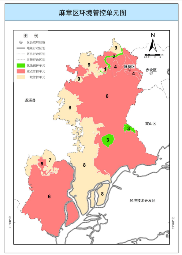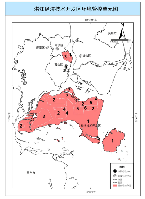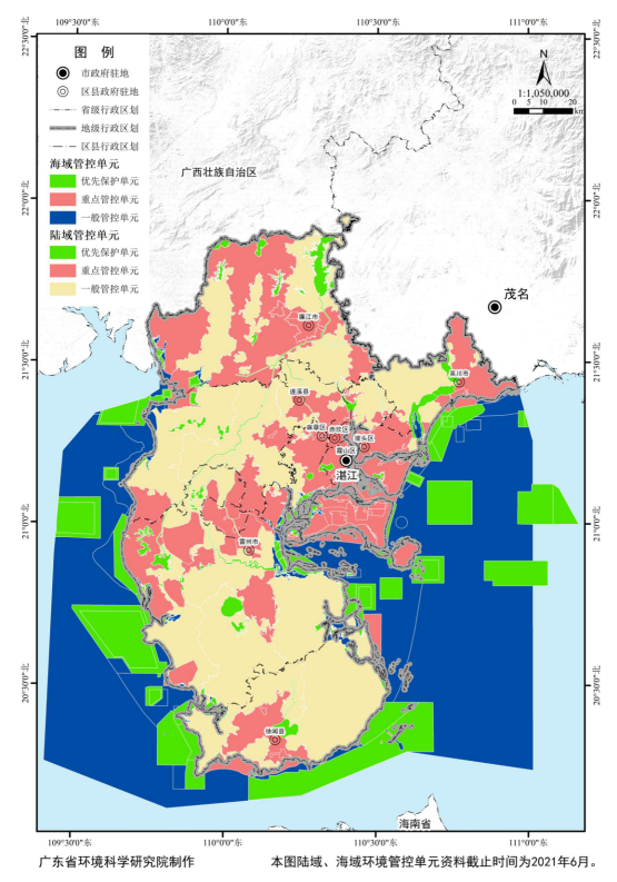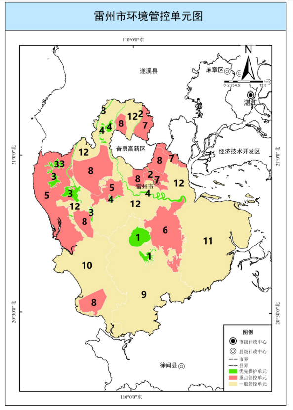 全市共划定陆域环境管控单元89个,其中,优先保护单元23个,面积563.13平方公里,占全市陆域国土面积的4.25%,主要涵盖生态保护红线、一般生态空间、饮用水水源保护区、环境空气质量一类功能区等区域,主要分布在廉江北部丘陵山地生态屏障,雷州半岛中部林地生态屏障,以及南渡河、雷州青年运河、鉴江干流、鹤地水库、东吴水库、龙门水库、大水桥水库等饮用水水源保护区,与市域生态安全格局基本吻合;重点管控单元40个,面积5193.66平方公里,占全市陆域国土面积的39.15%,主要包括工业集聚、人口集中和环境质量超标区域;一般管控单元26个,面积7507.77平方公里,占全市陆域国土面积的56.60%,为优先保护单元、重点管控单元以外的区域。