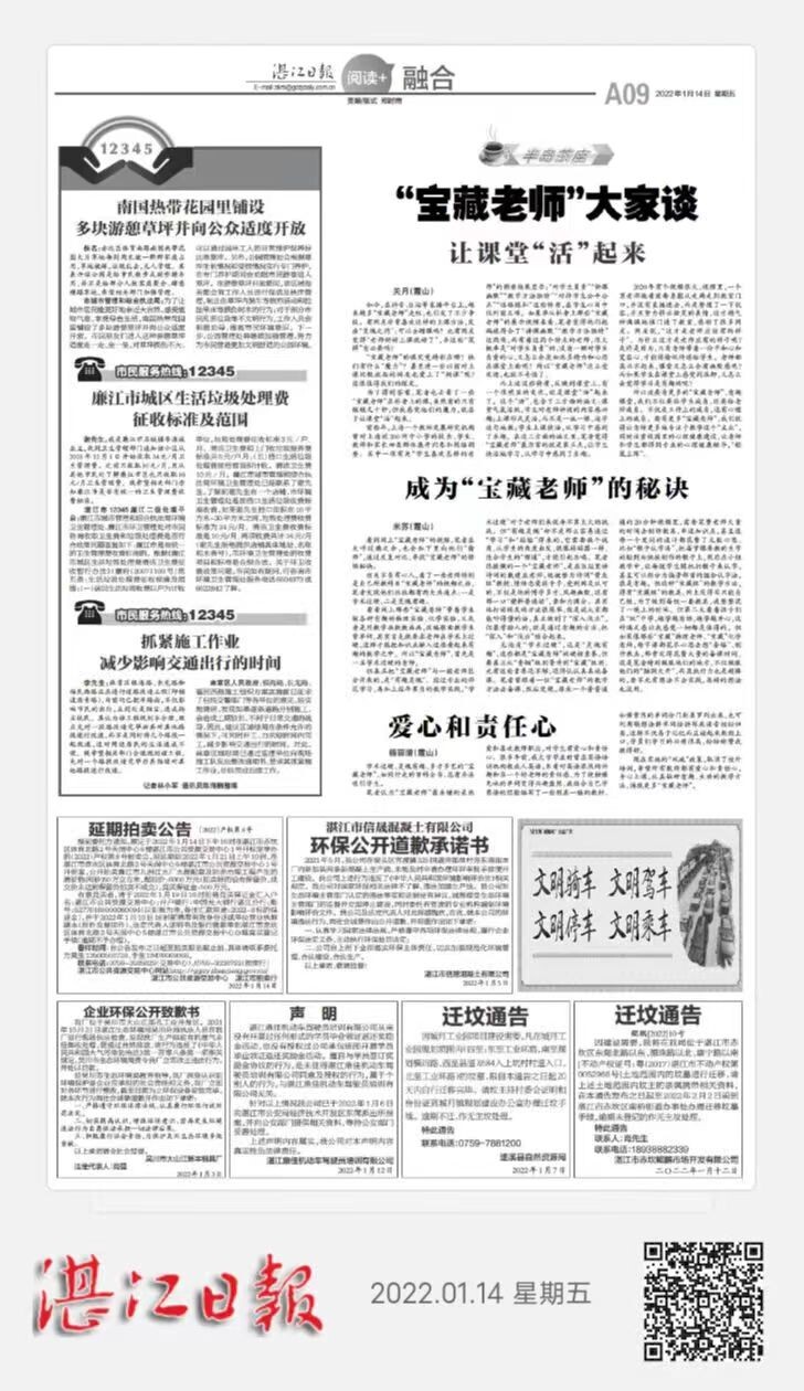 湛江市信晟混凝土有限公司、吴川市大山江新丰钢具厂于2022年1月14日在湛江日报公开道歉,作出履行行政处罚决定和环保守法承诺。