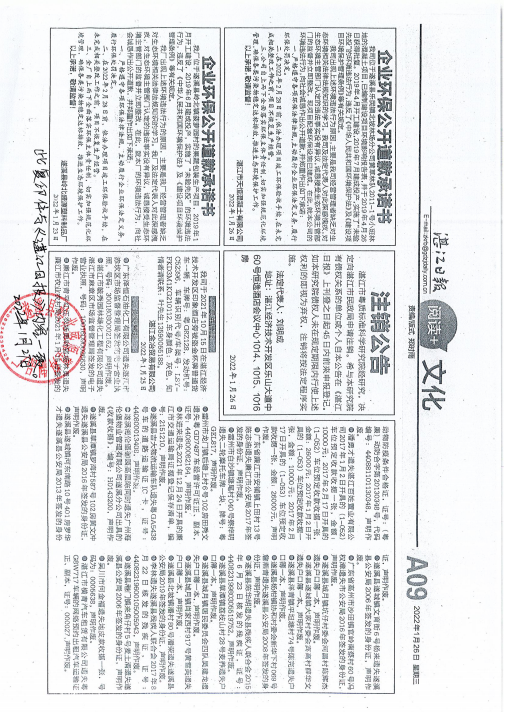 湛江市青方环保科技有限公司于2022年5月12日在湛江日报公开道歉并作出守法承诺。