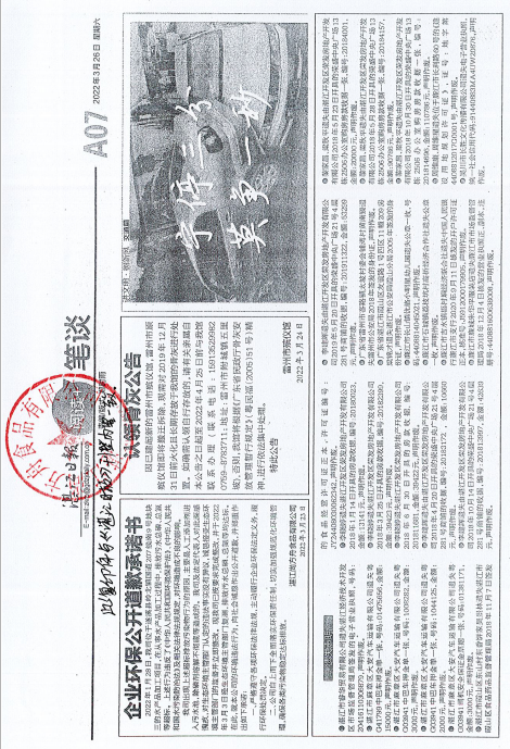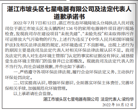 湛江市坡头区七星电器有限公司于2022年10月14日在湛江日报A11版登报,公开道歉并做出守法承诺。