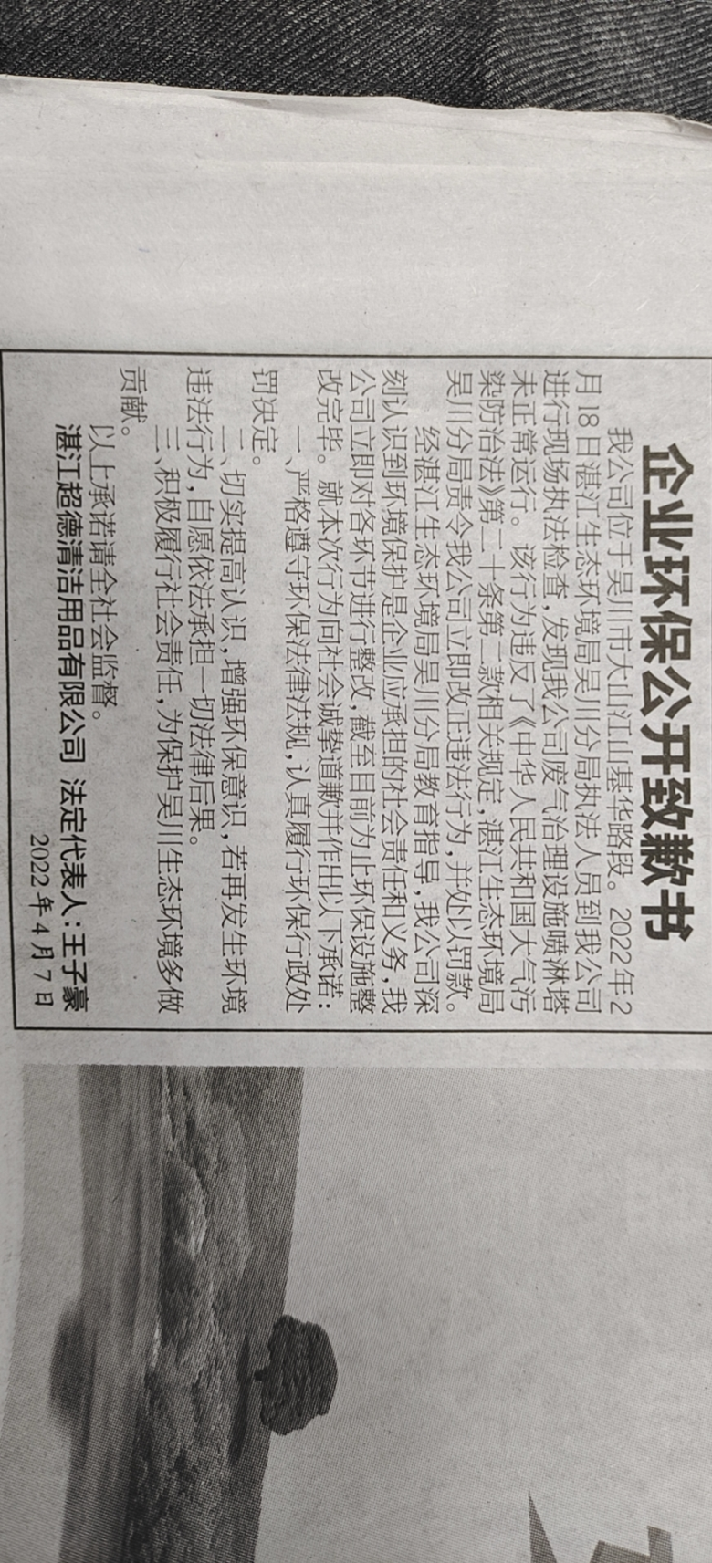 湛江超德清洁用品有限公司于2022年4月7日在湛江日报公开道歉,作出履行行政处罚决定和环保守法承诺。