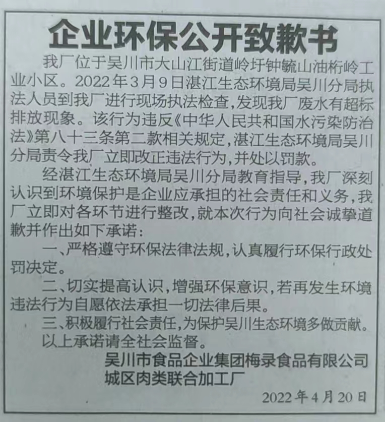 吴川市食品企业集团梅录食品有限公司城区肉类联合加工厂于2022年4月20日在湛江日报公开道歉,作出履行行政处罚决定和环保守法承诺。