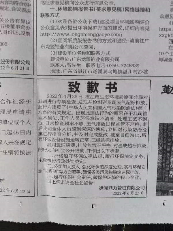 徐闻鼎力管桩有限公司于2022年6月23日在湛江日报公开道歉并作出守法承诺。