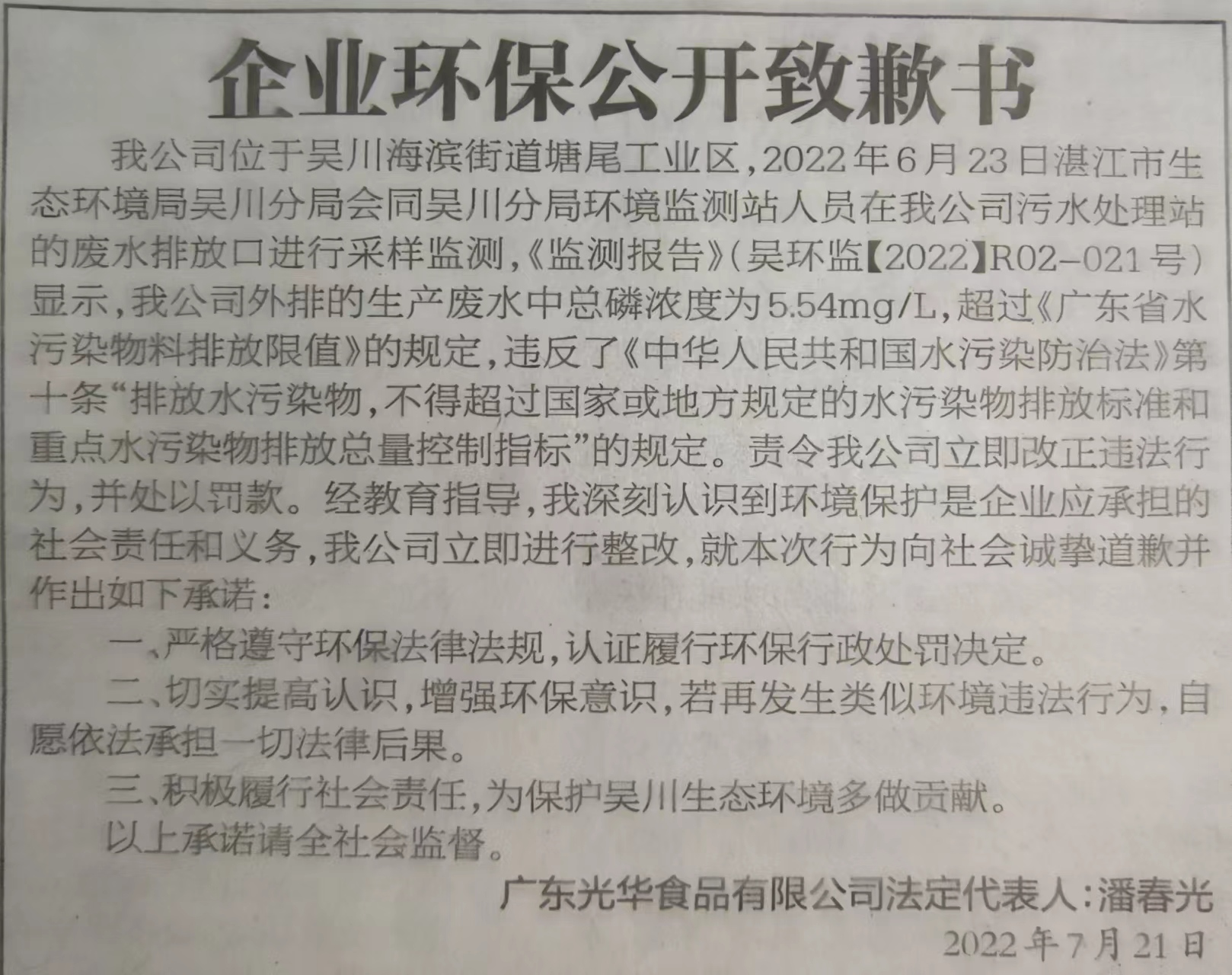 广东光华食品有限公司于2022年7月22日在湛江日报公开道歉并作出守法承诺。
