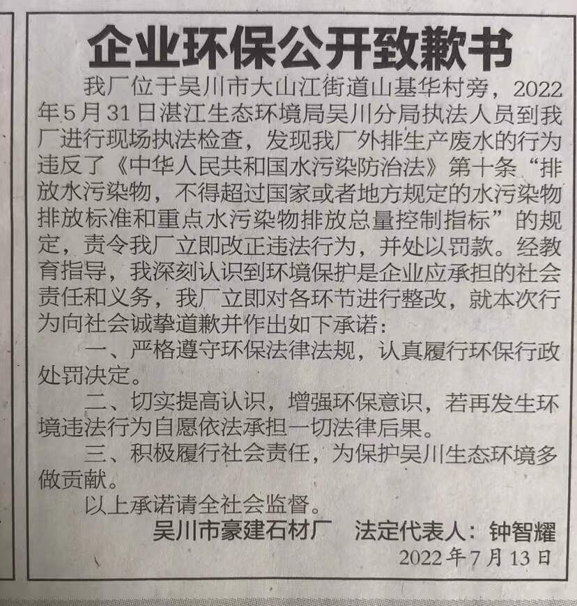 吴川市豪建石材厂于2022年7月15日在湛江日报公开道歉并作出守法承诺。