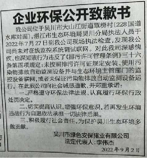 吴川市绿色安保猪业有限公司于9月2日在湛江日报公开道歉并作出守法承诺。