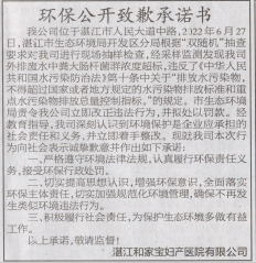 吴川网雨大精神病医院于2022年8月11日在《湛江日报》A09版公开道歉并作出环保守法承诺。
