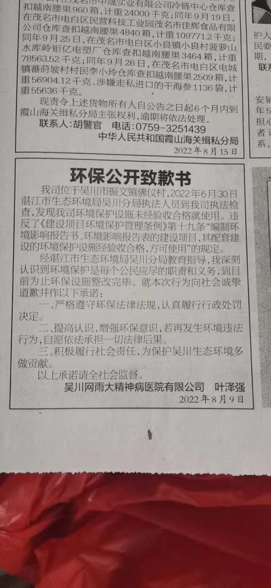 2022年8月17日,吴川网雨大精神病医院直接负责验收工作的行政科科长叶泽强主动在《湛江日报》A09版公开道歉并作出环保守法承诺。