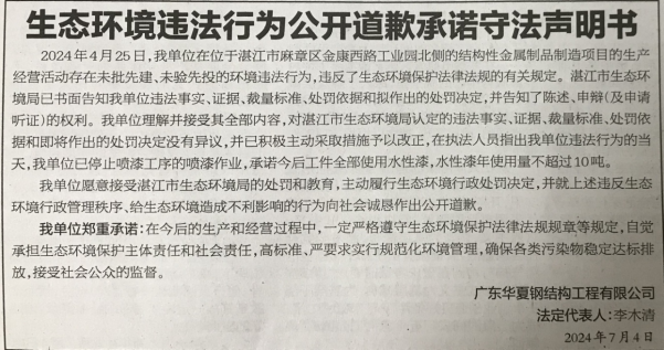广东华夏钢结构工程公司和李木清于2024年7月5日在湛江日报A04版刊登《生态环境违法行为公开道歉承诺守法声明书》,向社会公开道歉,作出履行行政处罚决定和环保守法的承诺。