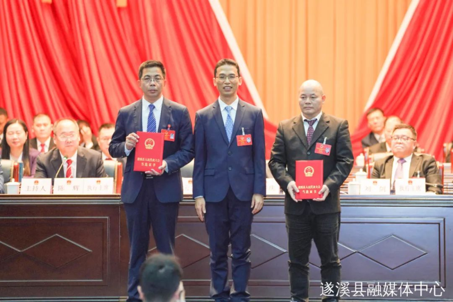 遂溪县委书记骆华庆为新当选的遂溪县第十七届人民代表大会常务委员会主任沈东宇颁发当选证书,沈东宇为新当选的遂溪县第十七届人民代表大会常务委员会副主任朱力、黄彦彤颁发当选证书。