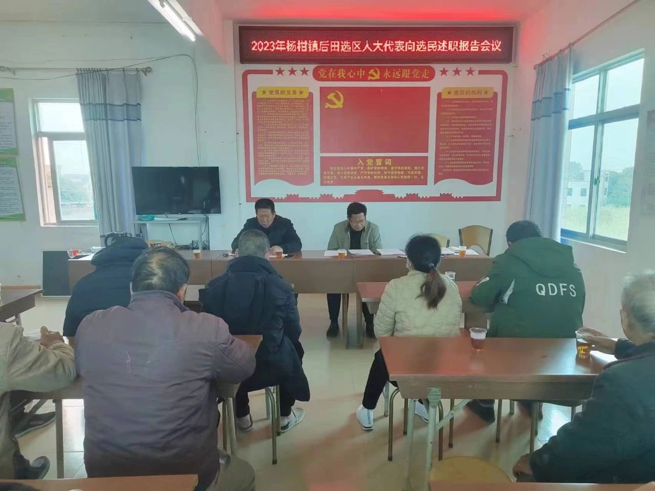 为进一步加强人大代表与选民的联系,自觉接受选民的监督,提高代表依法履职能力,激励代表履职主动性和积极性,增强为民服务责任感和使命感。12月21日,杨柑镇人大组织开展后田选区人大代表向选民述职活动,4名人大代表向选民述职,24名选民代表现场对述职代表进行评议和测评。