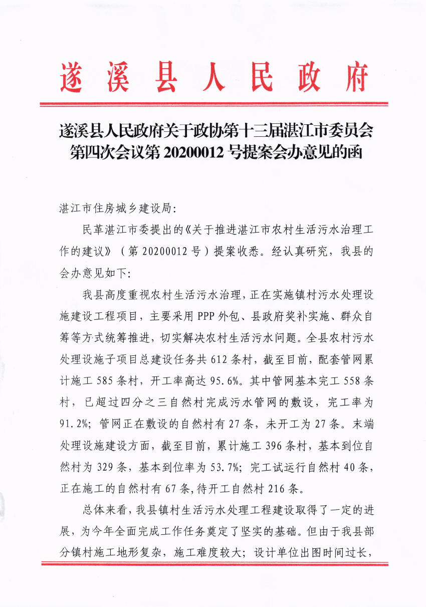 遂溪县人民政府关于政协第十三届湛江市委员会第四次会议第20200012号提案会办意见的函