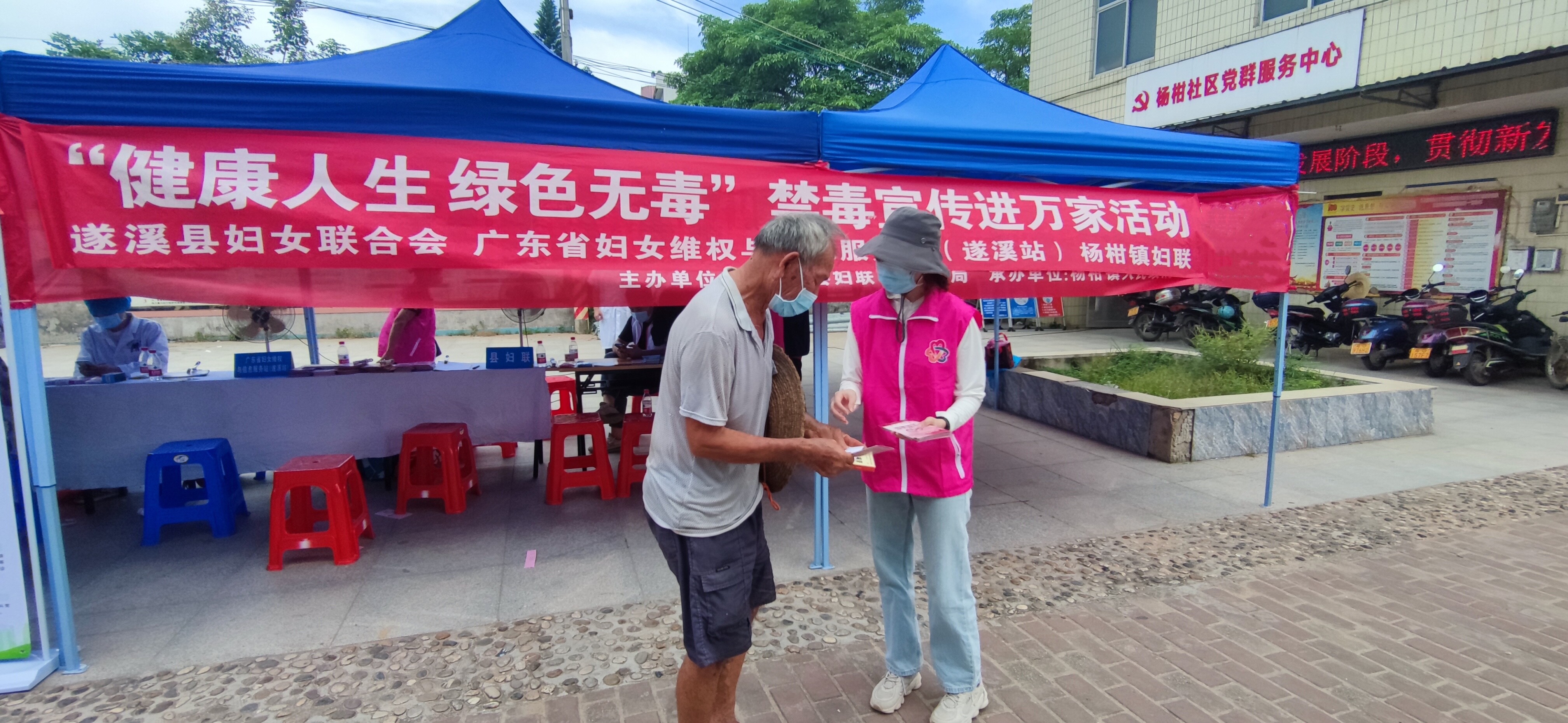 为进一步加强禁毒宣传教育力度,提高广大妇女及家庭成员识毒、防毒、 拒毒、禁毒意识和能力,621日,遂溪县妇联、广东省妇女维权与信息服务站(遂溪站)、杨柑镇妇联在杨柑镇联合开展以“健康人生 绿色无毒”为主题的禁毒宣传进万家活动。