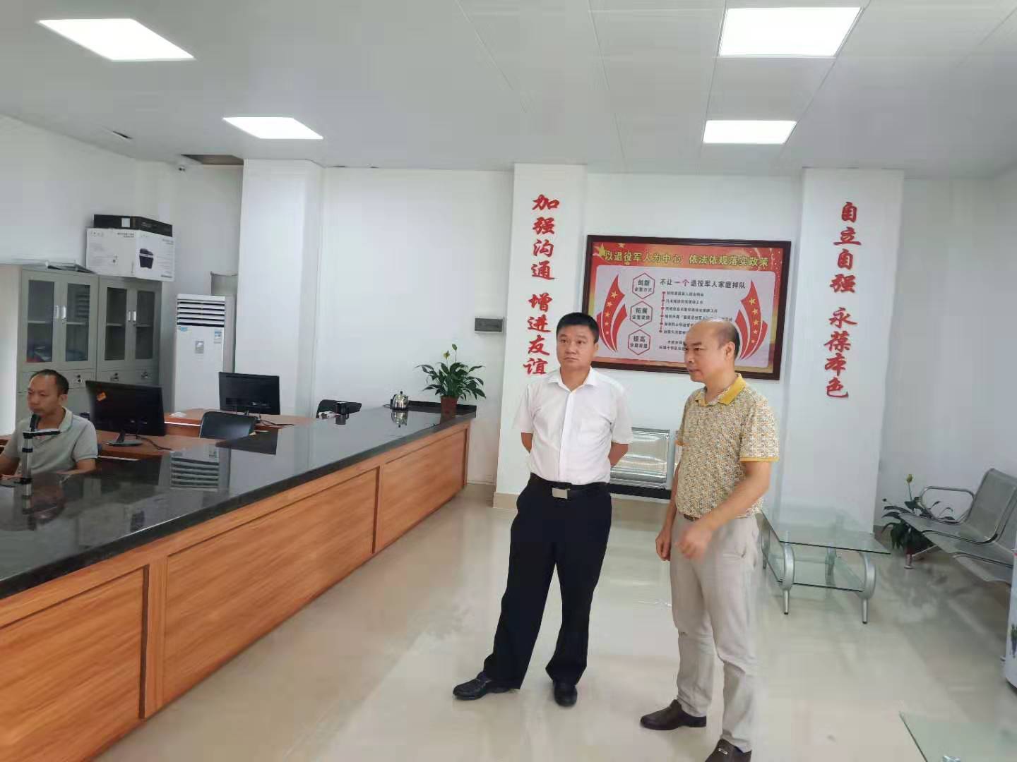 2019年6月20日,市退役军人事务局局长陈典聪一行到我局调研指导退役军人服务保障体系建设工作,当日上午,陈典聪局长一行在黄家宝局长陪同下参观了县退役军人服务中心、局办公场所建设情况。
