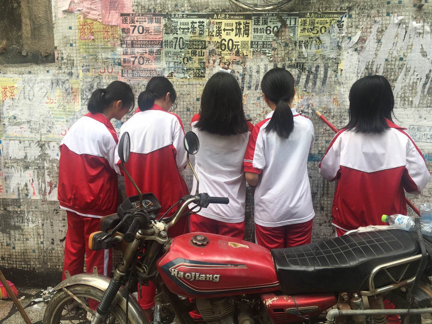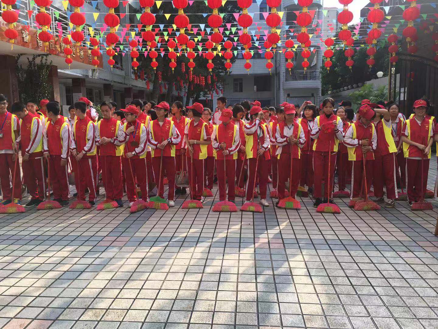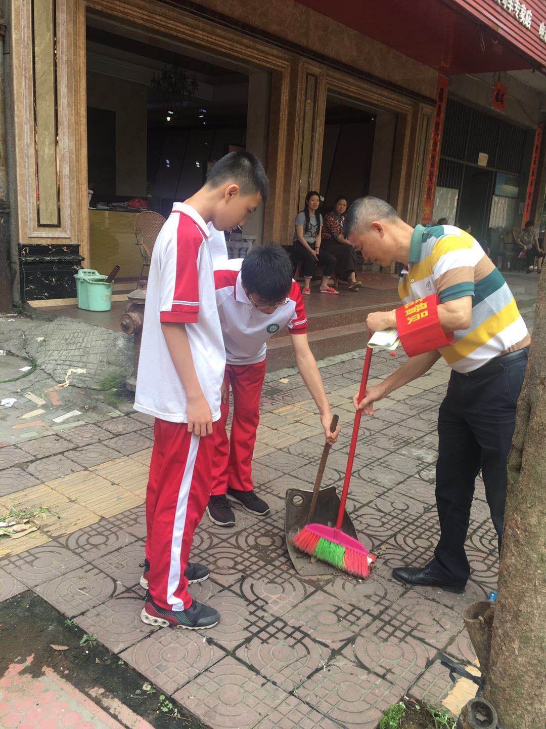 县大成初中校长及老师带领志愿服务队进行创文活动。