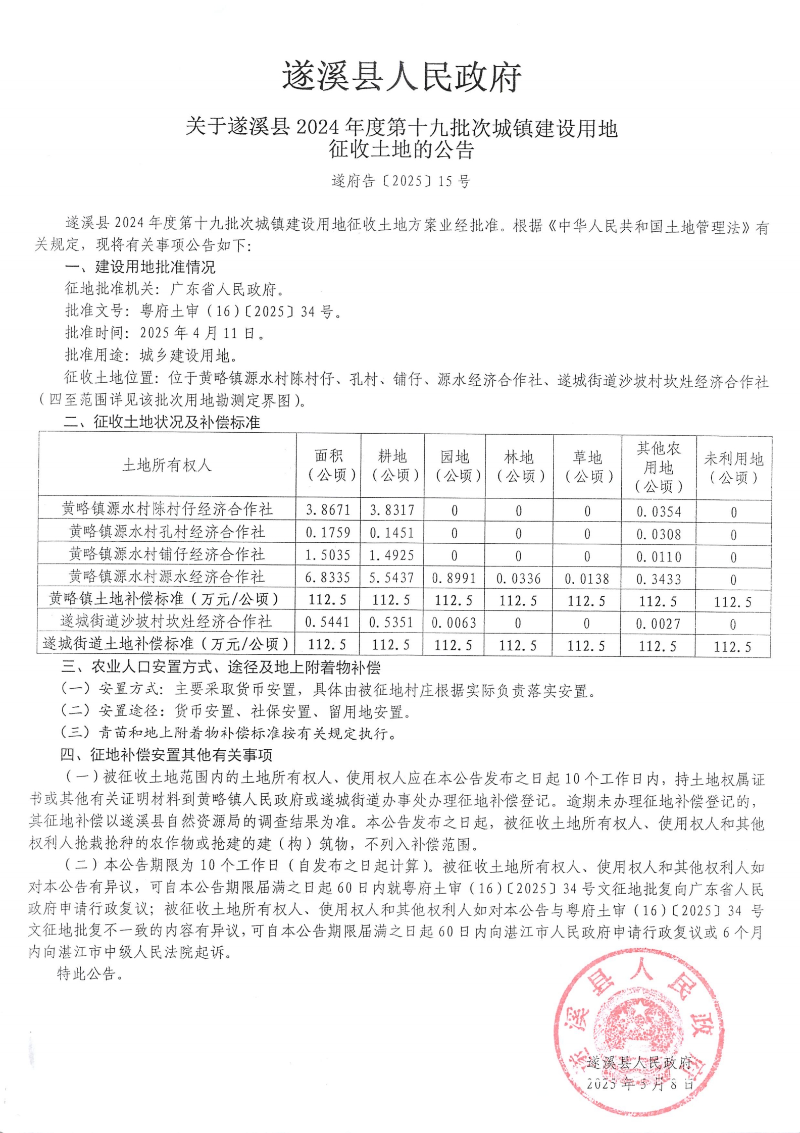 遂溪县人民政府关于遂溪县2024年度第十九批次城镇建设用地征收土地的公告 遂府告〔2025〕15号