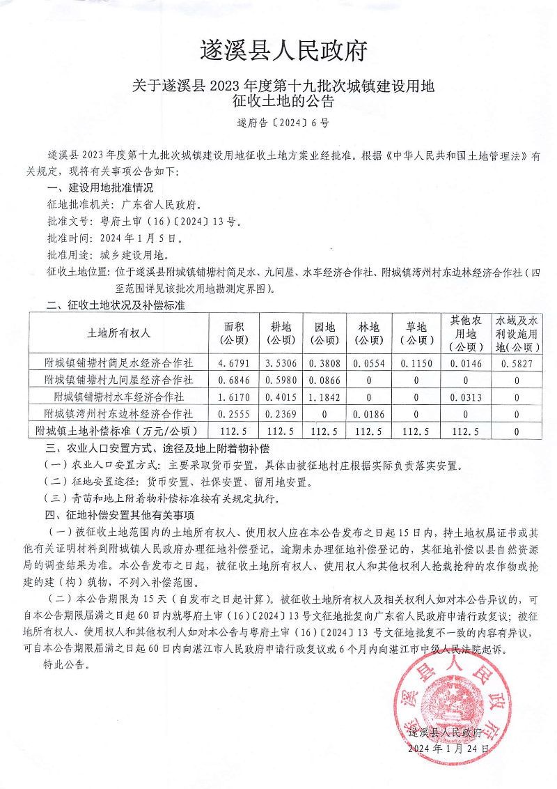 遂溪县人民政府 关于遂溪县2023年度第十九批次城镇建设用地征收土地的公告 遂府告〔2024〕6号