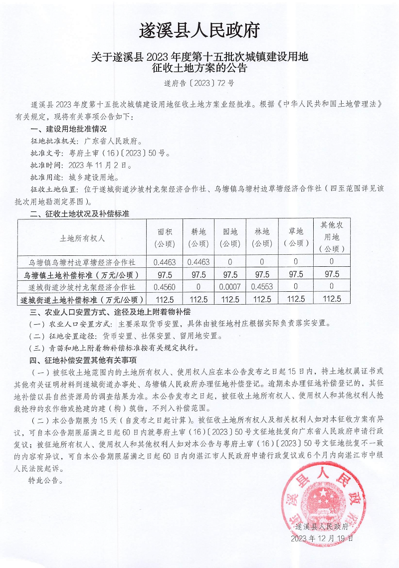遂溪县人民政府 关于遂溪县2023年度第十五批次城镇建设用地征收土地方案的公告 遂府告〔2023〕72号