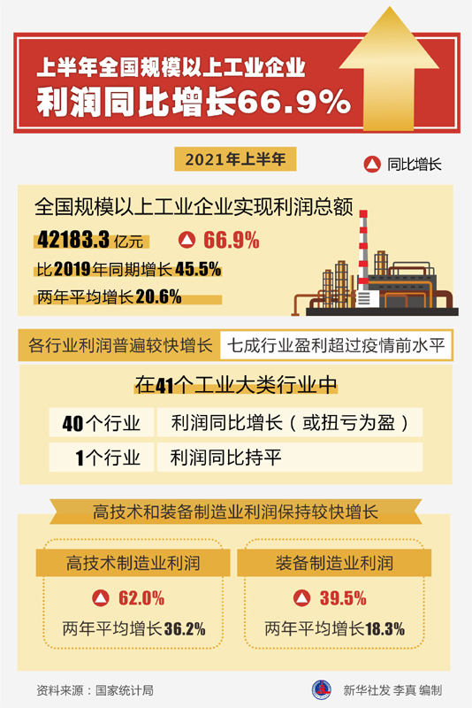 图表:上半年全国规模以上工业企业利润同比增长66.9%