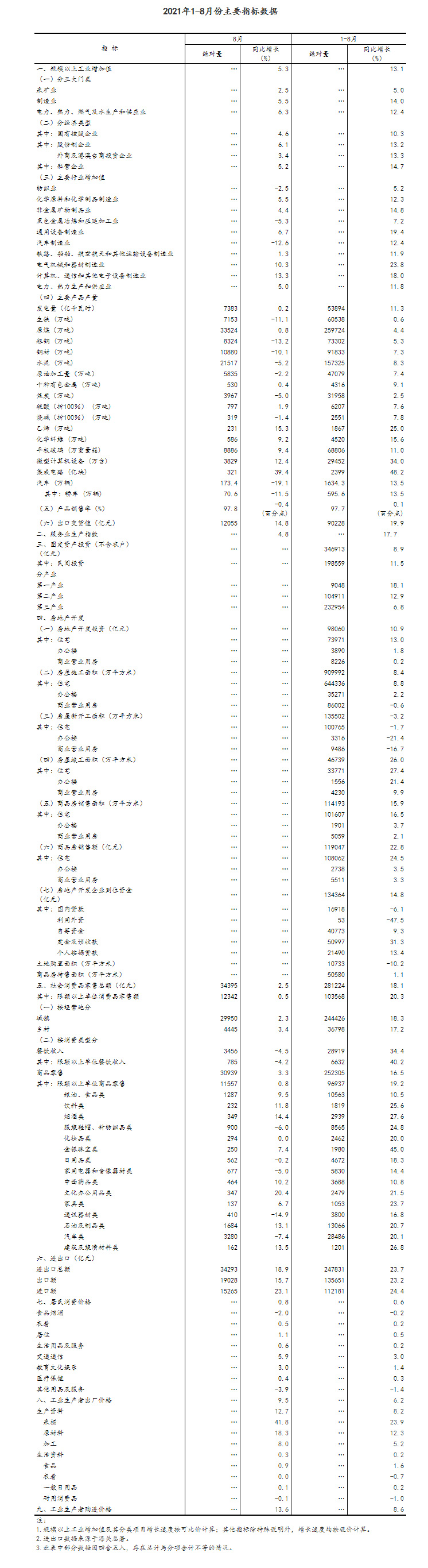 总的来看,8月份国民经济继续保持恢复态势。但也要看到,当前国际环境复杂严峻,国内疫情多点散发和汛情等自然灾害对经济运行的冲击显现,经济恢复的基础仍需巩固。下一步,要坚持以习近平新时代中国特色社会主义思想为指导,按照党中央、国务院决策部署,坚持稳中求进工作总基调,完整、准确、全面贯彻新发展理念,深化供给侧结构性改革,加快构建新发展格局,有效实施宏观政策跨周期调节,巩固拓展统筹疫情防控和经济社会发展成果,保持经济运行在合理区间,促进经济高质量发展。