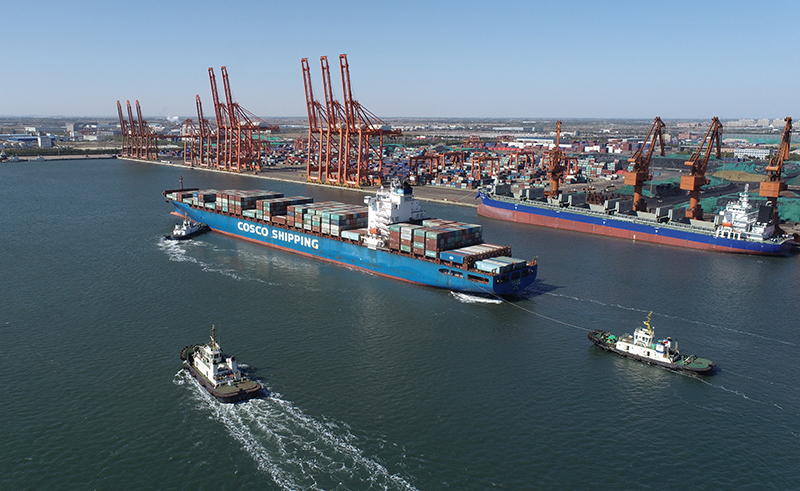 10月23日,一艘轮船向唐山港京唐港区集装箱码头靠泊(无人机照片)。新华社记者 朱旭东 摄