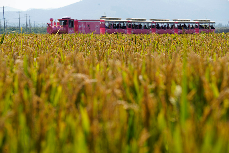 10月7日,游客在河北唐山遵化市团瓢庄乡山里各庄村乘坐观光小火车欣赏稻田秋景。新华社发(刘满仓 摄)