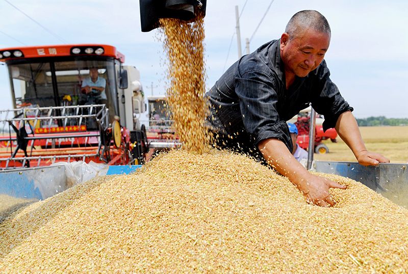6月13日,河北省衡水市阜城县崔家庙镇前砖门村农民在麦田收获小麦。新华社记者 朱旭东 摄