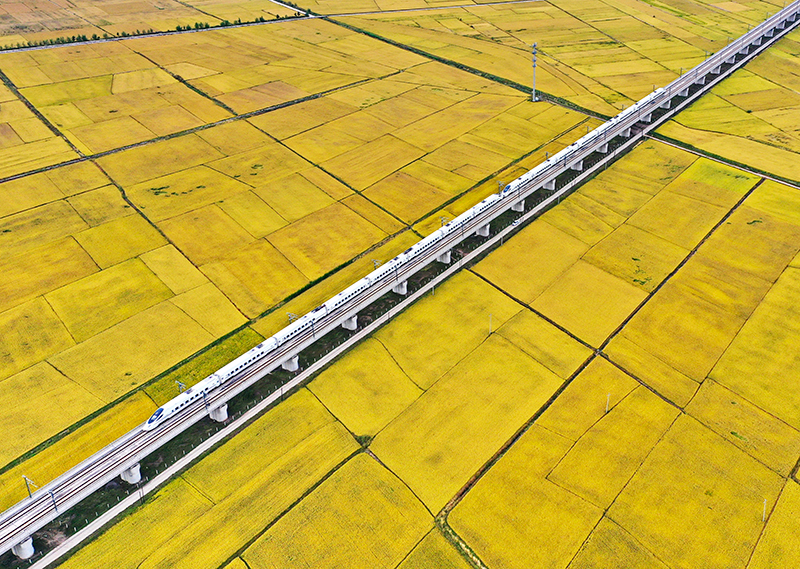 9月19日,高铁列车从吉林省公主岭市沃野间驶过(无人机照片)。新华社记者 张楠 摄