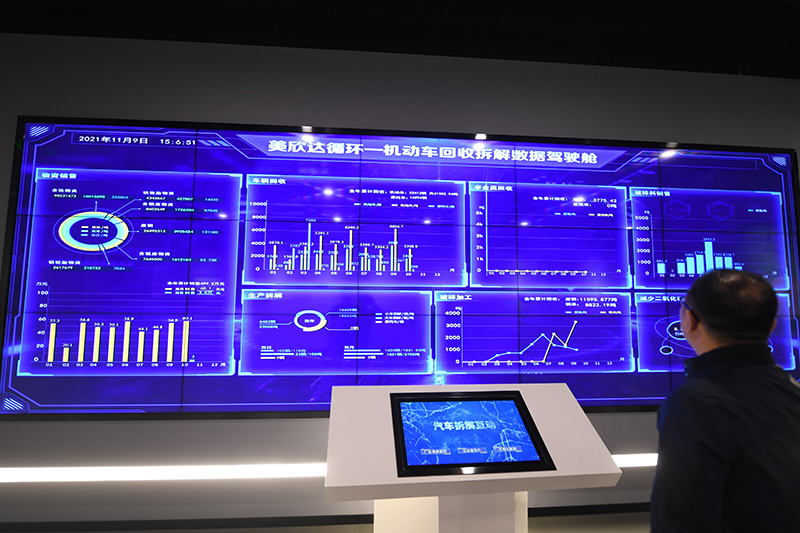 11月9日,在湖州市吴兴区一家机动车回收拆解企业,数字大屏上显示厂区拆解车辆的各项数据。
