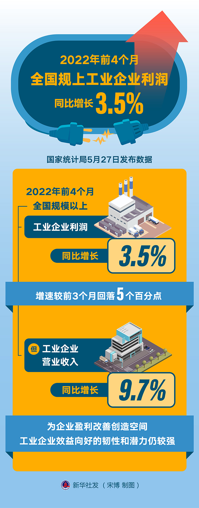 国家统计局5月27日发布数据,今年前4个月,全国规模以上工业企业利润同比增长3.5%,增速较前3个月回落5个百分点。但工业企业营业收入同比增长9.7%,为企业盈利改善创造空间,工业企业效益向好的韧性和潜力仍较强。