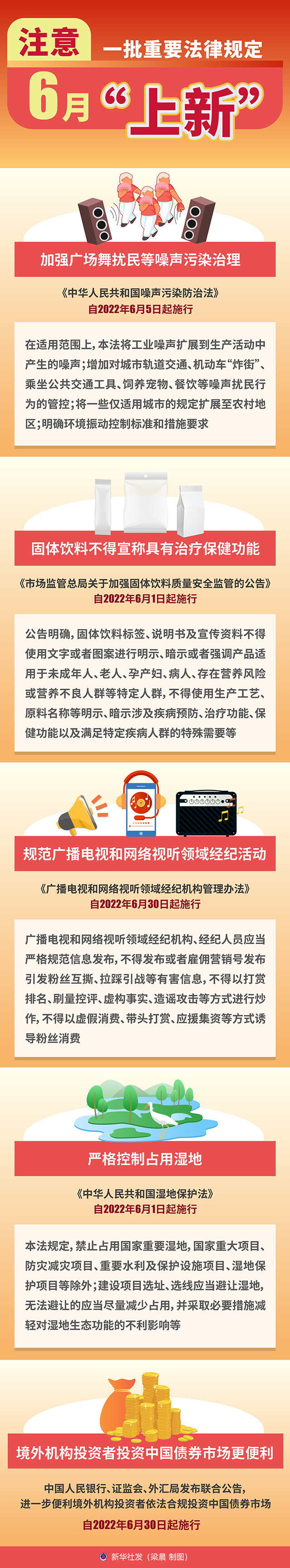 这个6月,一批关系社会民生的新规开始施行,从加强噪声污染治理到严管固体饮料质量安全再到规范广播电视和网络视听领域经纪活动等,以法治之力守护你我美好生活。