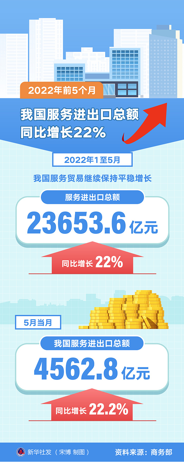 2022年1至5月,我国服务贸易继续保持平稳增长,服务进出口总额23653.6亿元,同比增长22%。5月当月,我国服务进出口总额4562.8亿元,同比增长22.2%。