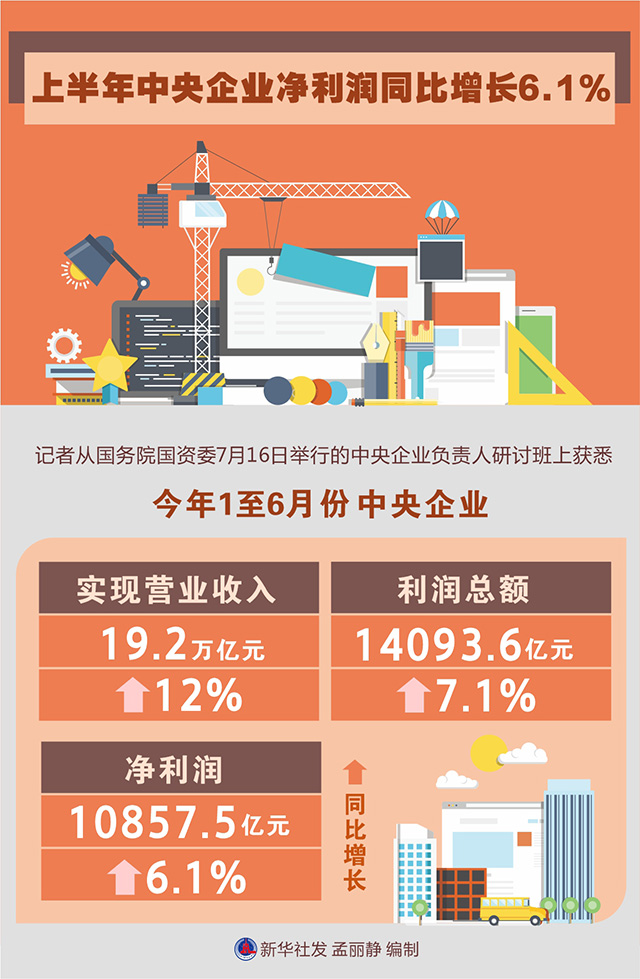 记者从国务院国资委7月16日举行的中央企业负责人研讨班上获悉,今年1至6月份,中央企业实现营业收入19.2万亿元、利润总额14093.6亿元、净利润10857.5亿元,同比分别增长12%、7.1%、6.1%。