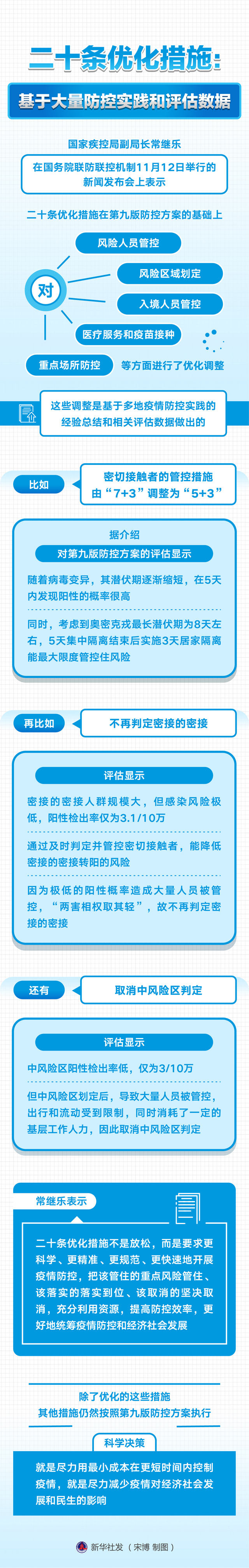 国家疾控局副局长常继乐在国务院联防联控机制11月12日举行的新闻发布会上表示,二十条优化措施在第九版防控方案的基础上,对风险人员管控、风险区域划定、入境人员管控、医疗服务和疫苗接种、重点场所防控等方面进行了优化调整。这些调整是基于多地疫情防控实践的经验总结和相关评估数据做出的。
