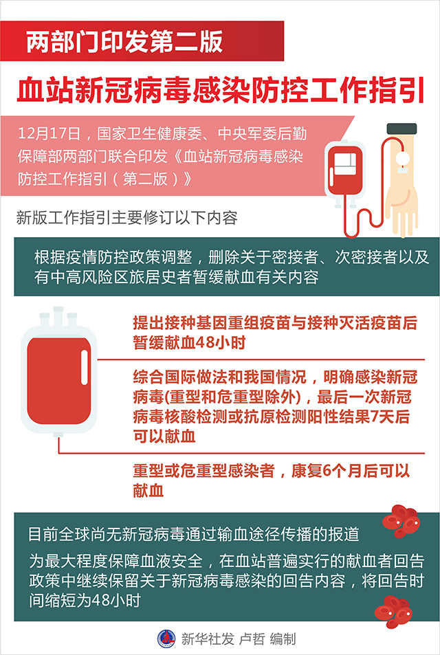 血站新冠病毒感染防控工作事关血液安全平稳供应。12月17日,国家卫生健康委、中央军委后勤保障部两部门联合印发《血站新冠病毒感染防控工作指引(第二版)》,指导采供血机构切实做好新形势下疫情防控工作,保障血站工作人员和献血者安全,实现血液安全供应。