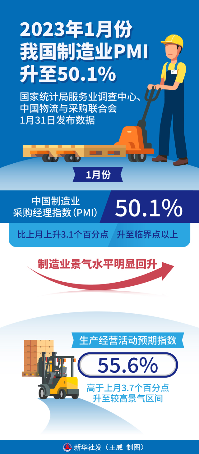 国家统计局服务业调查中心、中国物流与采购联合会1月31日发布数据,1月份,中国制造业采购经理指数(PMI)为50.1%,比上月上升3.1个百分点,升至临界点以上,制造业景气水平明显回升。
