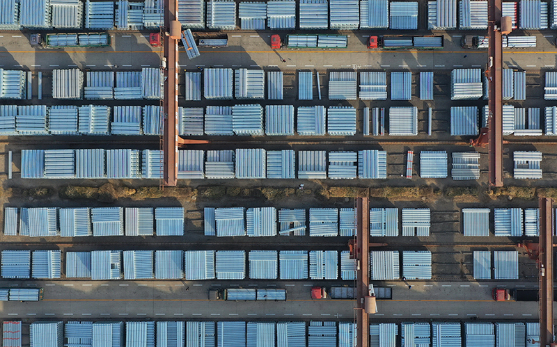 2月19日,工人在唐山市丰南区一家镀锌钢管企业仓储区操作设备吊装镀锌钢管(无人机照片)。