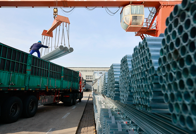 2月19日,工人在唐山市丰南区一家镀锌钢管企业仓储区操作设备吊装镀锌钢管。