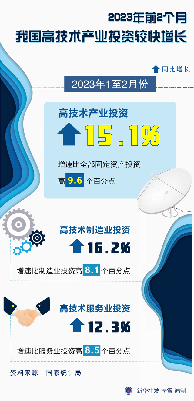 今年前2个月我国高技术产业投资较快增长。国家统计局日前发布数据显示,1至2月份,高技术产业投资同比增长15.1%,增速比全部固定资产投资高9.6个百分点。