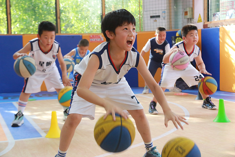 10月2日,孩子们在山东省高密市一篮球训练营进行篮球基本功训练。