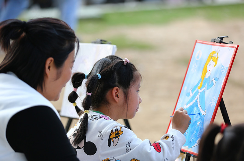 10月3日,家长陪着孩子在山东省滕州市弘道公园学习绘画。