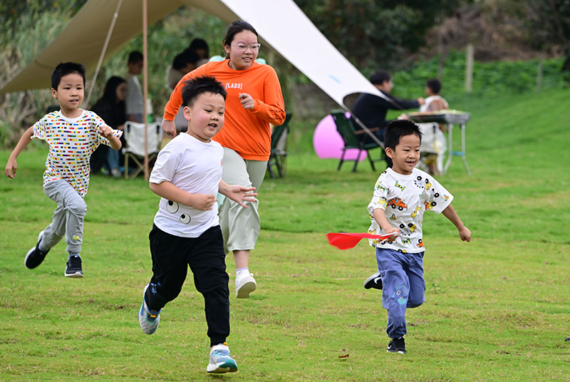 10月3日,小朋友在江苏省淮安市金湖县吕良镇三园村一处农庄追逐玩耍。