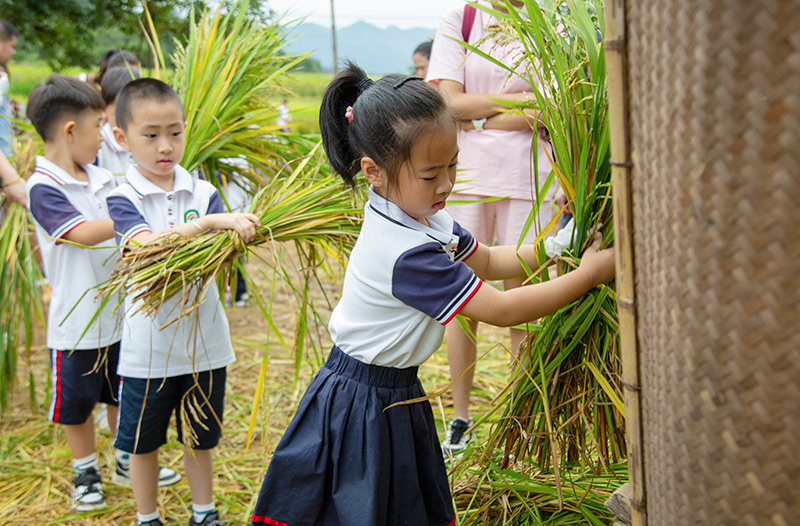 10月2日,在福建省武夷山市下梅村,小朋友在体验手工打谷。